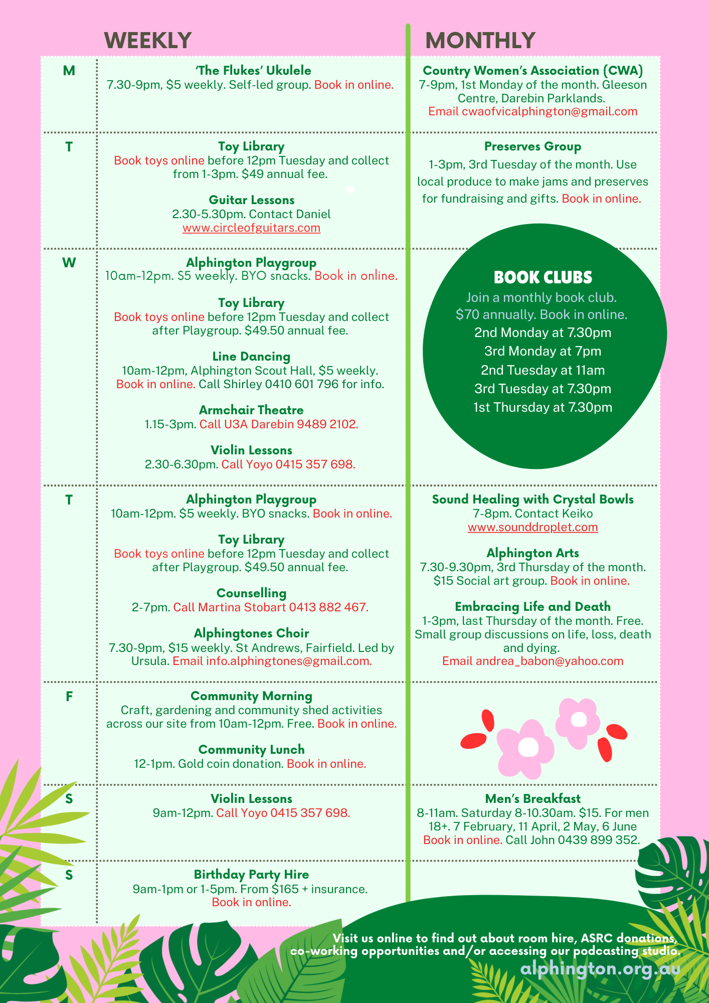 Alphington Community Centre is a food collection point for the Asylum Seeker Resource Centre. Find our more about what you leave and exactly where to leave it here.