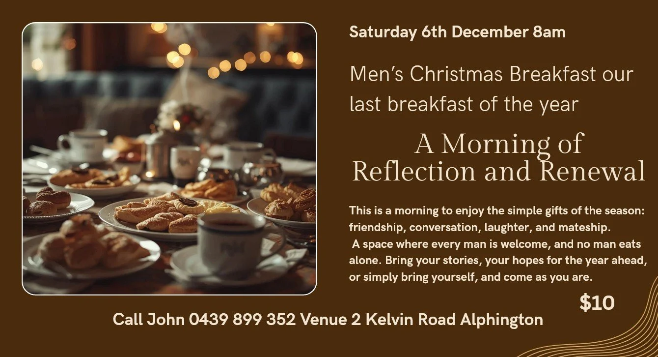 As we come to the end of another big year, you’re invited to join us for our final men’s breakfast of 2025 — a chance to slow down, breathe out, and share good company around the table.